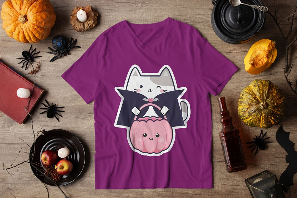 Bügelbild Vampir-Katze – niedliches Halloween-Motiv mit Umhang & pinkem Kürbis-Eimer Gruselig süß und verspielt. Dieses Bügelbild zeigt eine Katze, die sich als Vampir verkleidet hat. Mit schwarzem Umhang, lilafarbenem Kragen und einem kleinen Fledermausdetail ist der klassische Vampir-Look perfekt eingefangen – allerdings in einer niedlichen, katzenhaften Version. Ein Motiv, das Halloween-Flair mit Charme verbindet.Vor sich hält die Katze einen pinkfarbenen Kürbis-Eimer mit fröhlichem Gesicht, wie er traditionell zum Süßigkeitensammeln genutzt wird. Ideal für Kinder, Teenager und alle Katzenfans, die Halloween lieben, aber lieber auf süße als gruselige Designs setzen. Ob auf Shirts, Hoodies oder Taschen – die Vampir-Katze sorgt garantiert für ein Lächeln.Das Bügelbild ist hochwertig gedruckt, lässt sich leicht auf Baumwollstoffe wie Shirts, Sweater, Hoodies, Stofftaschen oder Kissenbezüge aufbringen und bleibt bei richtiger Pflege lange farbintensiv und formstabil. Ein langlebiger Textiltransfer, der Halloween-Outfits eine niedliche, verspielte Note verleiht.Du willst noch mehr Bügelbilder mit Monstern, Vampiren und dem Hauch von Apokalypse entdecken? Dann wirf einen Blick auf unsere Horror-Kollektion – und finde dein nächstes Lieblingsmotiv!