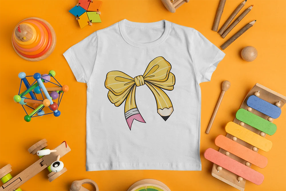 Bügelbild Schleife im Bleistift-Look – kreatives Schulmotiv für Kinder, Lehrer & DIY-Fans Kreativ, verspielt und ideal für die Schule. Dieses Bügelbild zeigt eine gelbe Schleife, deren Enden wie eine Bleistiftspitze und ein Radiergummi gestaltet sind. Das Design verbindet klassische Schulutensilien mit einer fröhlichen, verspielten Optik – perfekt, um Alltagskleidung einen kreativen Twist zu geben. Ein originelles Motiv für kleine und große Schreibfans.Ob als Eyecatcher auf Kinder-Shirts, als süßes Detail auf Hoodies oder als dekoratives Highlight auf Stofftaschen – die Schleife im Bleistift-Look ist ein ideales Motiv für Schulanfang, Lehrer*innen-Geschenke oder DIY-Projekte rund ums Thema Lernen. Ein witziger Hingucker, der Bildung und Spaß perfekt kombiniert.Das Bügelbild ist hochwertig gedruckt, lässt sich mühelos auf Baumwollstoffe wie Shirts, Sweater, Hoodies, Stofftaschen oder Kissenbezüge aufbringen und bleibt bei richtiger Pflege lange farbintensiv und formstabil. Ein langlebiger Textiltransfer, der Mode mit einem cleveren Schul-Detail verknüpft.Du willst noch mehr Bügelbilder zum Thema Schule, Schulanfang und Einschulung entdecken? Dann wirf einen Blick auf unsere Schul-Kollektion – und finde dein nächstes Lieblingsmotiv!
