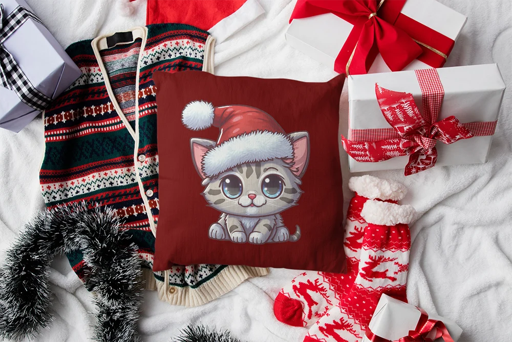 Bügelbild süßes Weihnachts-Kitten mit Weihnachtsmütze – niedliches Katzenmotiv für dein Weihnachtsoutfit Dieses Bügelbild zeigt ein besonders niedliches Kätzchen mit großen, glänzenden Augen und weichem, grau getigertem Fell. Auf dem Kopf trägt es eine kuschelige rote Weihnachtsmütze mit flauschigem weißen Rand, die perfekt zur festlichen Stimmung passt. Der liebevolle Blick, die zarten Details im Fell und die harmonische Farbgestaltung machen dieses Motiv zu einem echten Hingucker für die Winter- und Weihnachtszeit. Ob auf deinem Baumwoll-Shirt, Sweater oder Hoodie – dieses Weihnachts Katzen Bügelbild bringt sofort eine warme, verspielte Atmosphäre in dein Outfit. Auch auf Stoffbeuteln, Taschen oder Kissenbezügen aus Baumwolle sorgt das Design für süße Christmas Vibes. Ideal für Katzenliebhaber, Tierfans und alle, die ihr Weihnachtsoutfit mit einem charmanten Hingucker veredeln möchten. Das Bügelbild ist hochwertig gedruckt, überzeugt mit kräftigen, farbintensiven Details und lässt sich ganz einfach auf Baumwollstoffe wie Shirts, Hoodies, Sweater, Taschen oder Kissenbezüge aufbügeln. Bei richtiger Pflege bleibt das Motiv lange haltbar und behält seine strahlenden Farben – perfekt für viele gemütliche Wintermomente. Du willst noch mehr Bügelbilder mit winterlichen und weihnachtlichen Motiven entdecken? Dann wirf einen Blick auf unsere Winter-Kollektion – und finde dein nächstes Lieblingsmotiv!